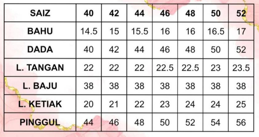Saiz bermula dari 38-52